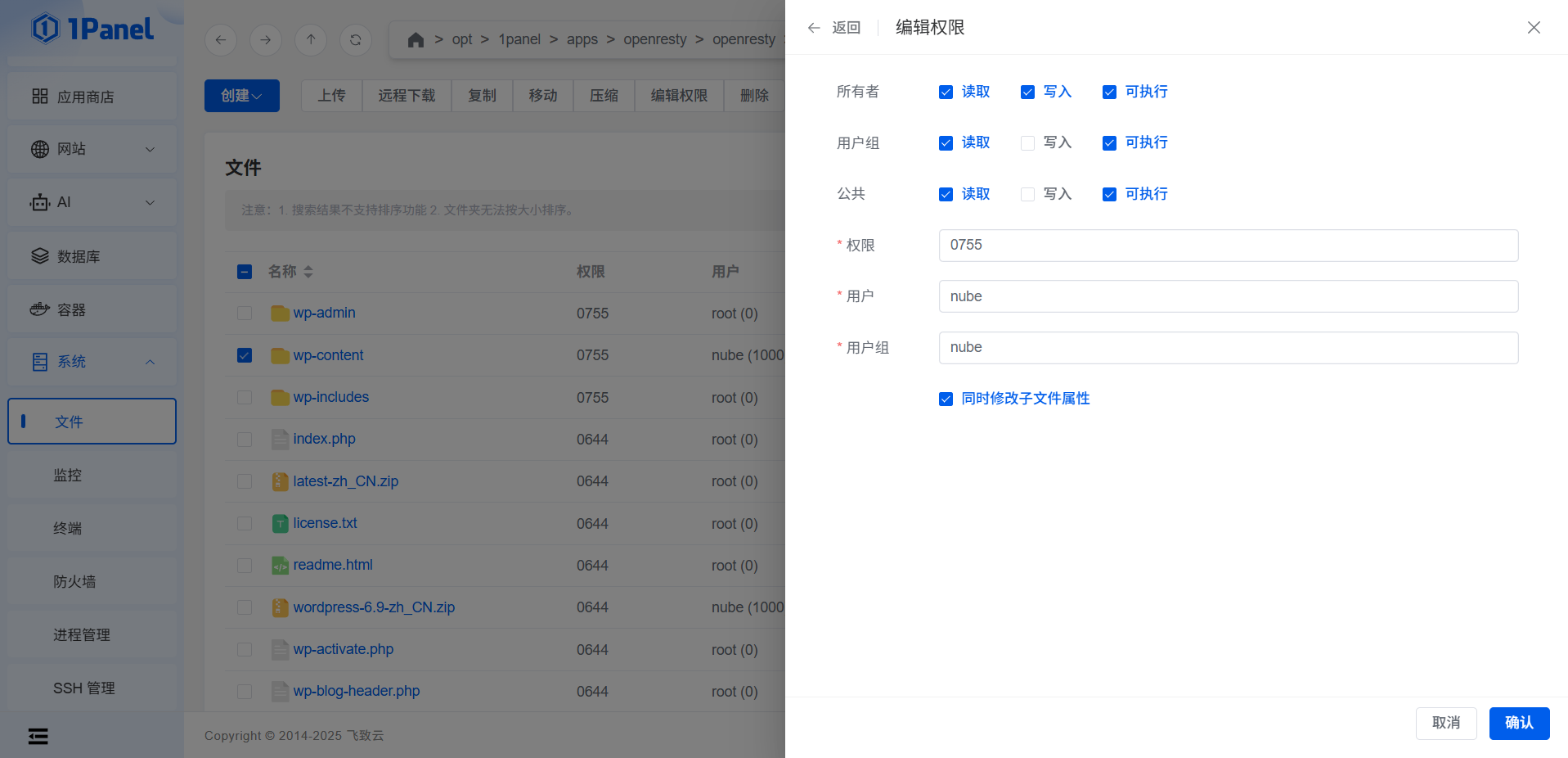 现在位置: 首页 / 未分类 / 正文 WordPress目录权限 aero 未分类 1天前 26热度 0评论 原因 解决方法 确定php进程用户 ps aux | grep php 如图用户名nube 使用Shell 第二步,使用如下命令改变属主并确保属主对目标目录具有读、写权限。 chown -R <1000:1000> </path/to/your/directory> 最后,在wordpress配置文件(wp-config.php)最后添加一行并保存。 define('FS_METHOD', 'direct'); 使用1Panel面板 1Panel面板